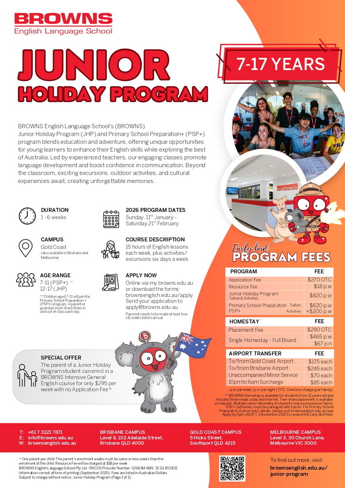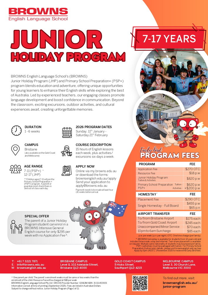 21年以上の教育経験があり、国内外から複数の受賞歴を持つ家族経営の語学学校、BROWNS English Language School (BROWNS)ではこれまで沢⼭のジュニア学⽣に⾼い教育の質、⽣徒様の満⾜度、サポート体制を整えたスタッフ、市 内中⼼部にある便利なロケーション等、質に特化した学校案内を⻑年 ⾏っております。現地校への進学に対応できるよ う⼩学校進学準備プログラム、中⾼進学準備プログラム などをご⽤意しており、その他、アクティビティと語学 学習をミックスしたジュニアホリデープログラムもご⽤意しています。